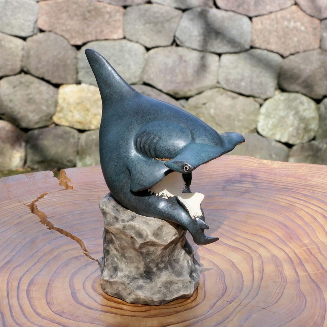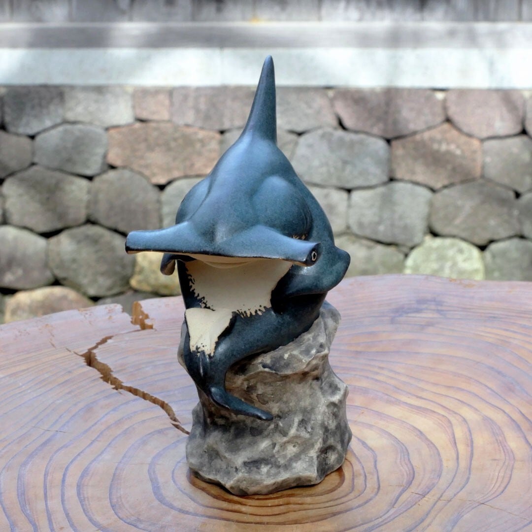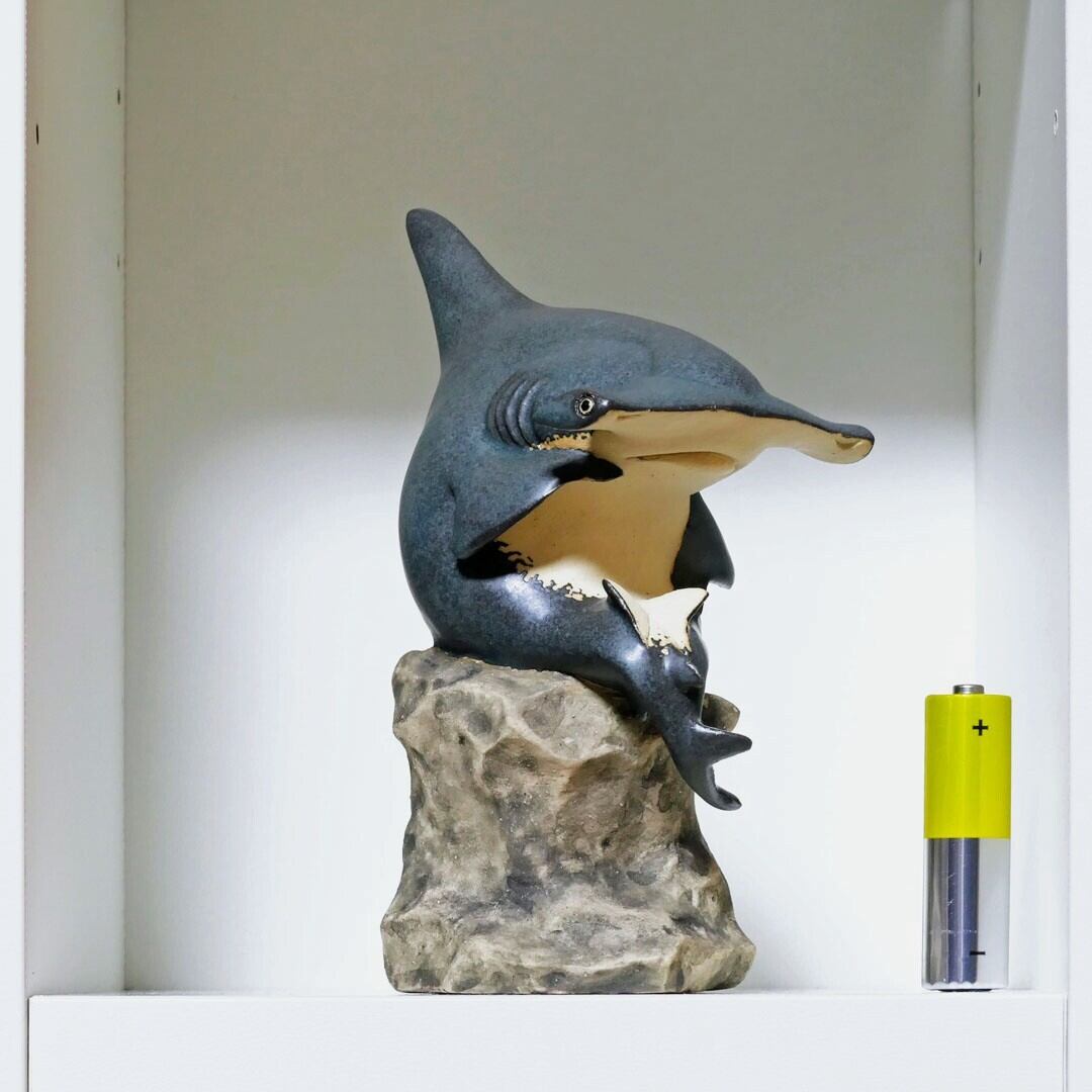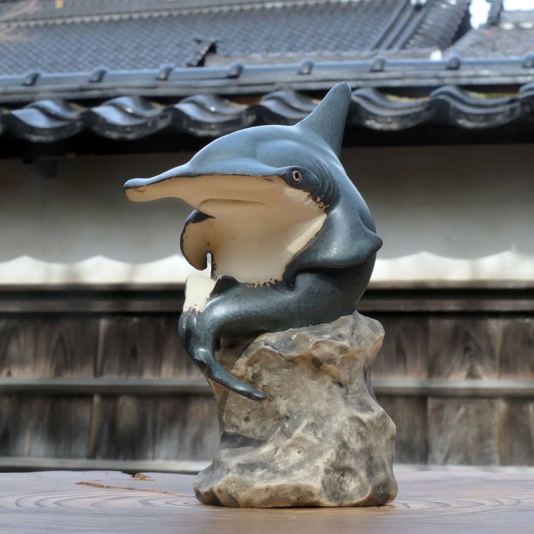 考える人をシュモクザメにアレンジした、陶製の彫刻です。