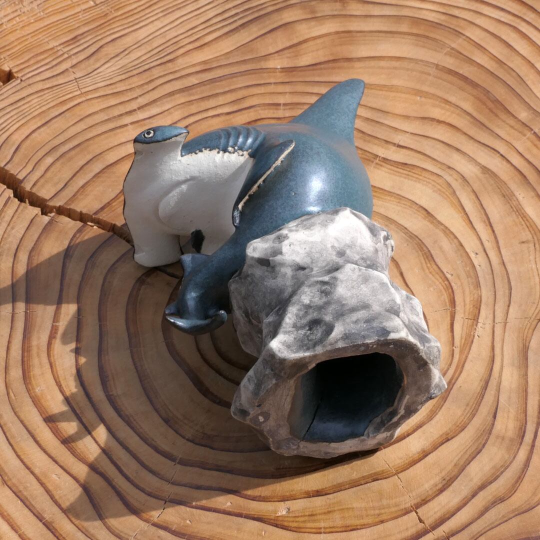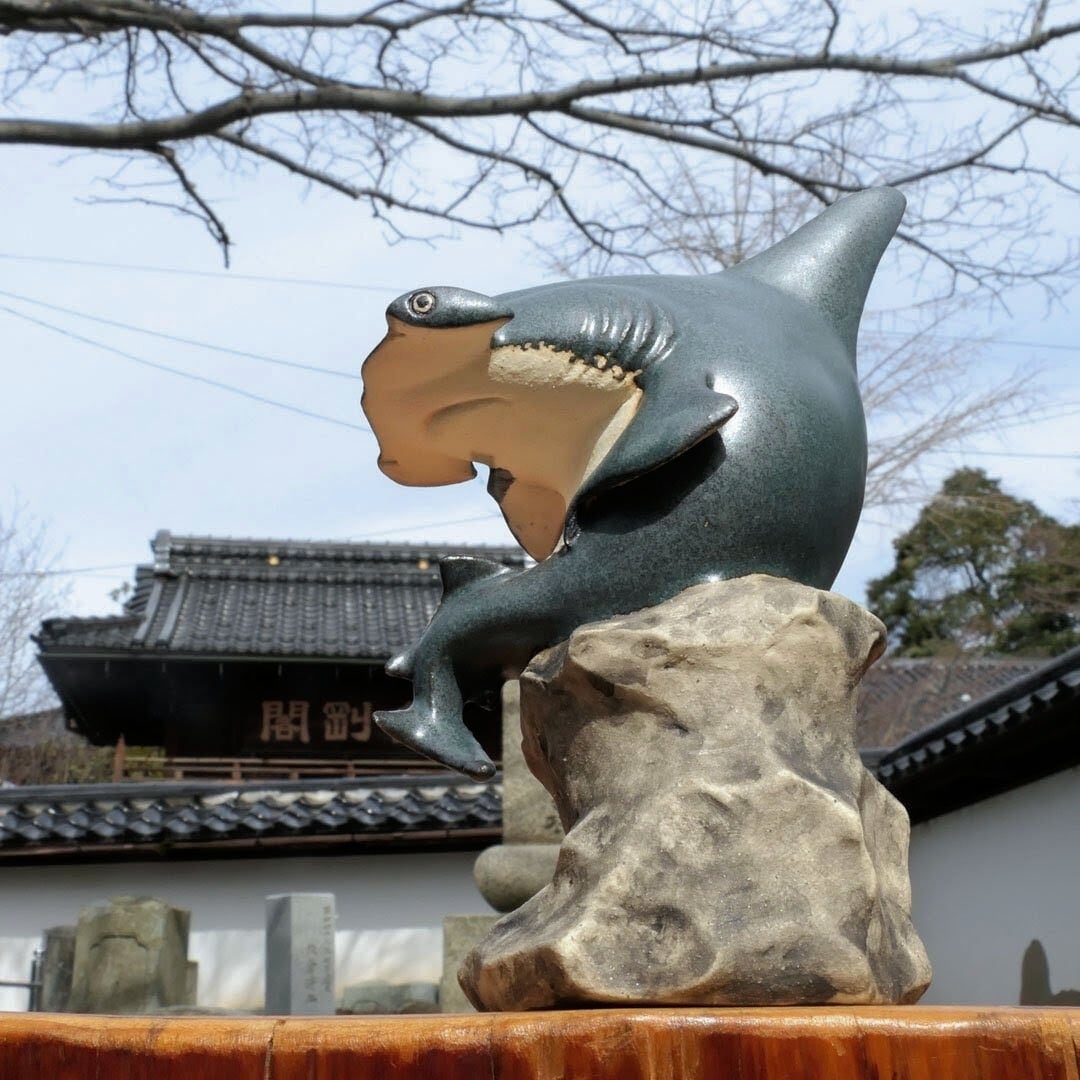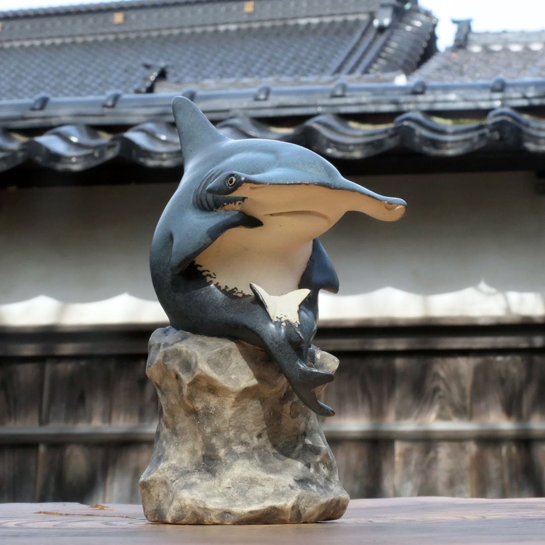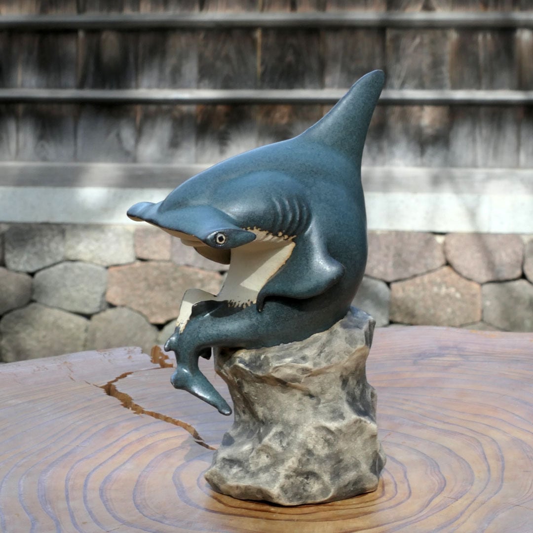 考える人をシュモクザメにアレンジした、陶製の彫刻です。