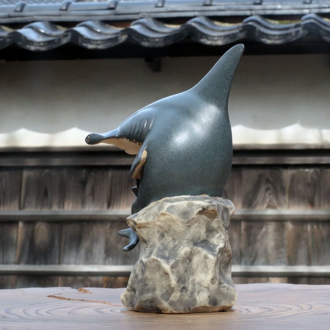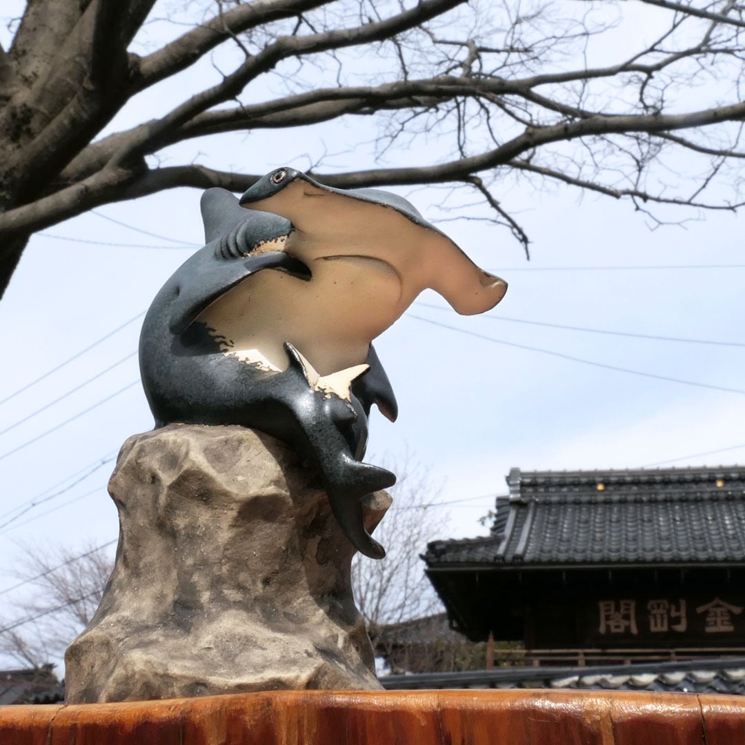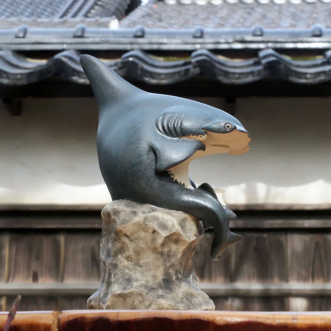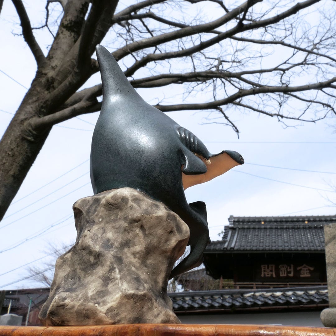 考える人をシュモクザメにアレンジした、陶製の彫刻です。