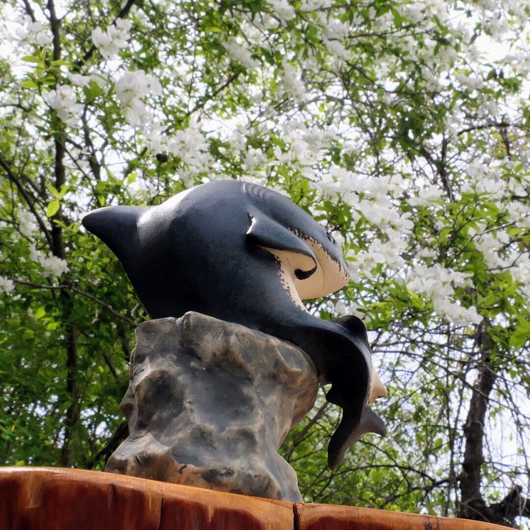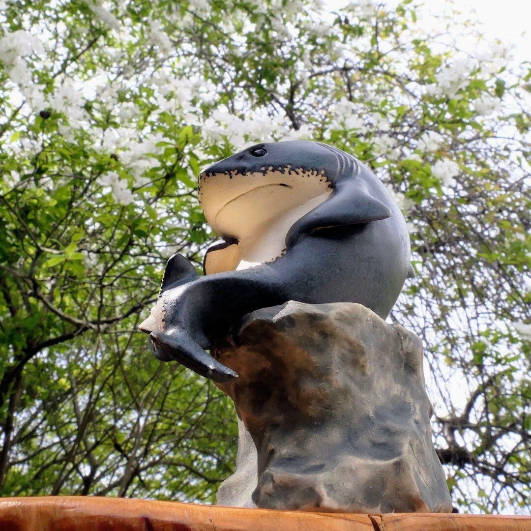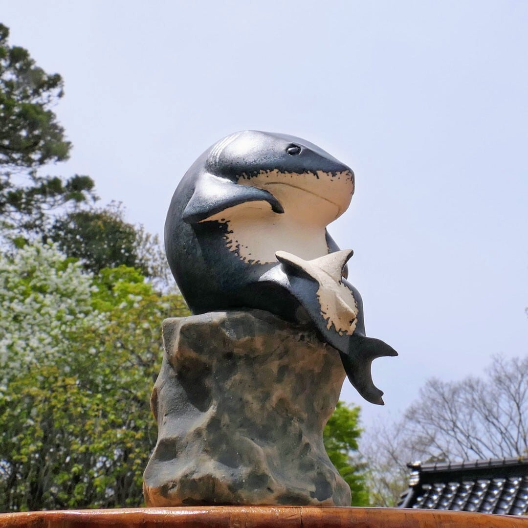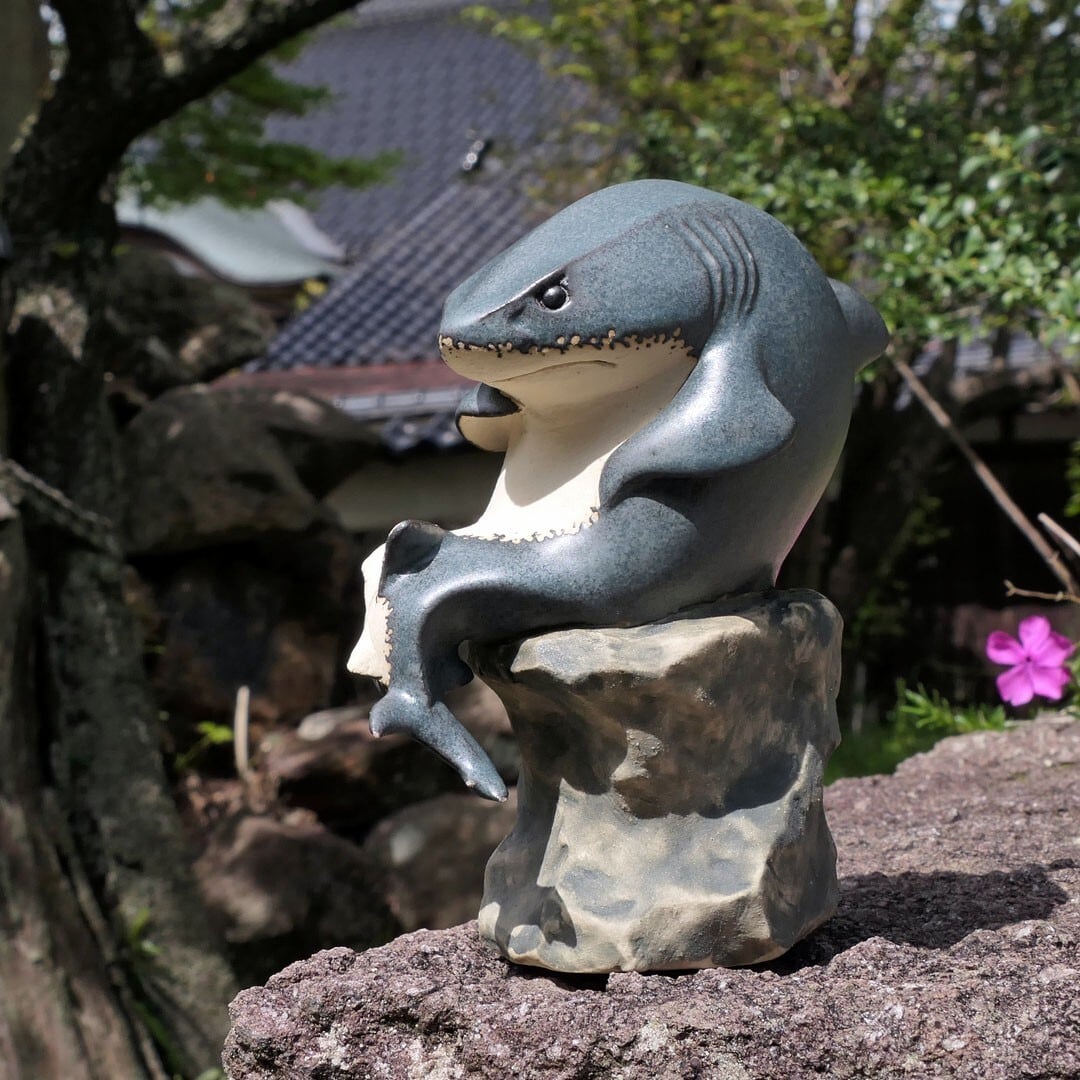 考える人をホホジロザメにアレンジした、陶製の彫刻です。