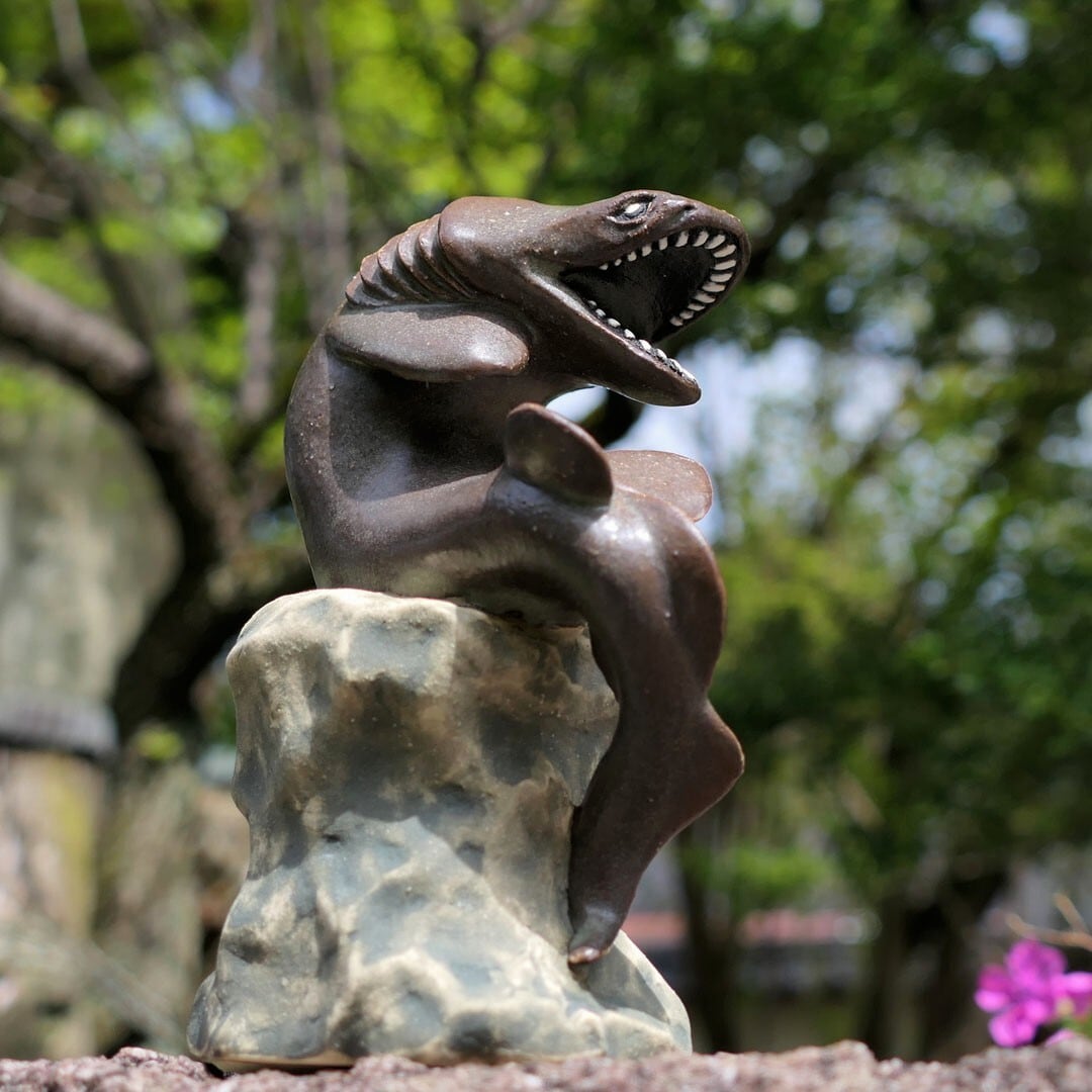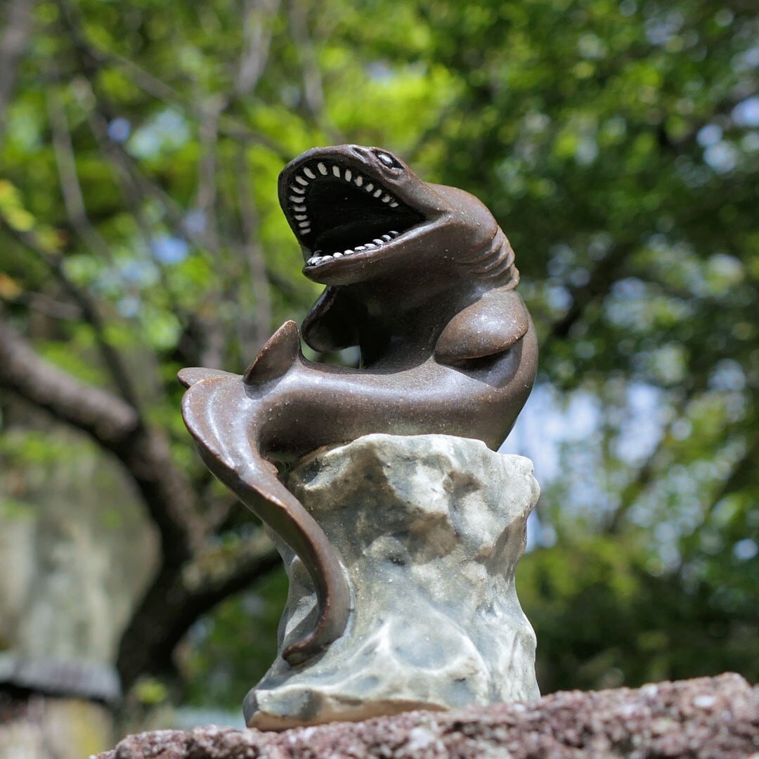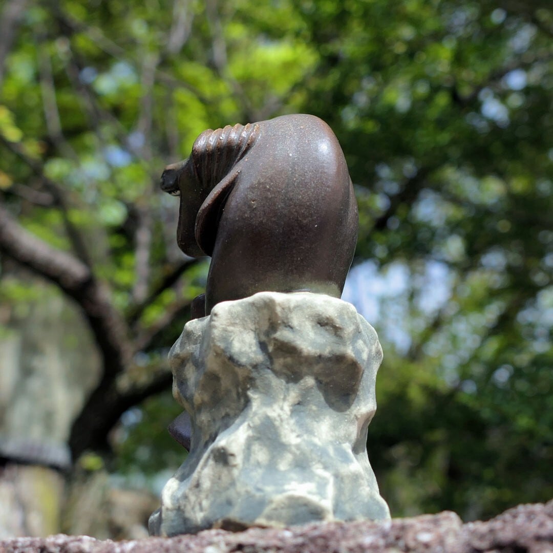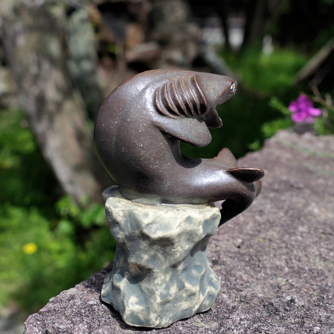 考える人をラブカにアレンジした、陶製の彫刻です。