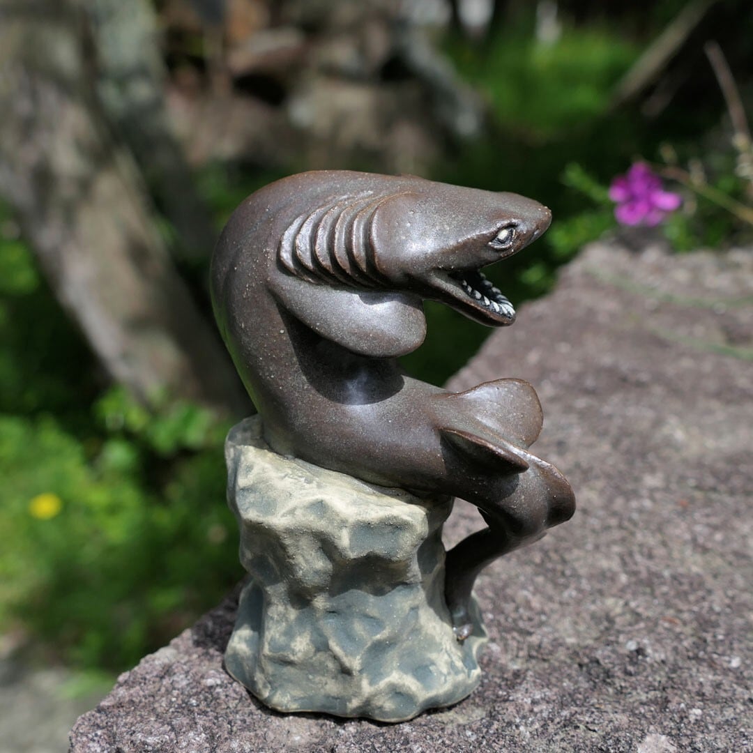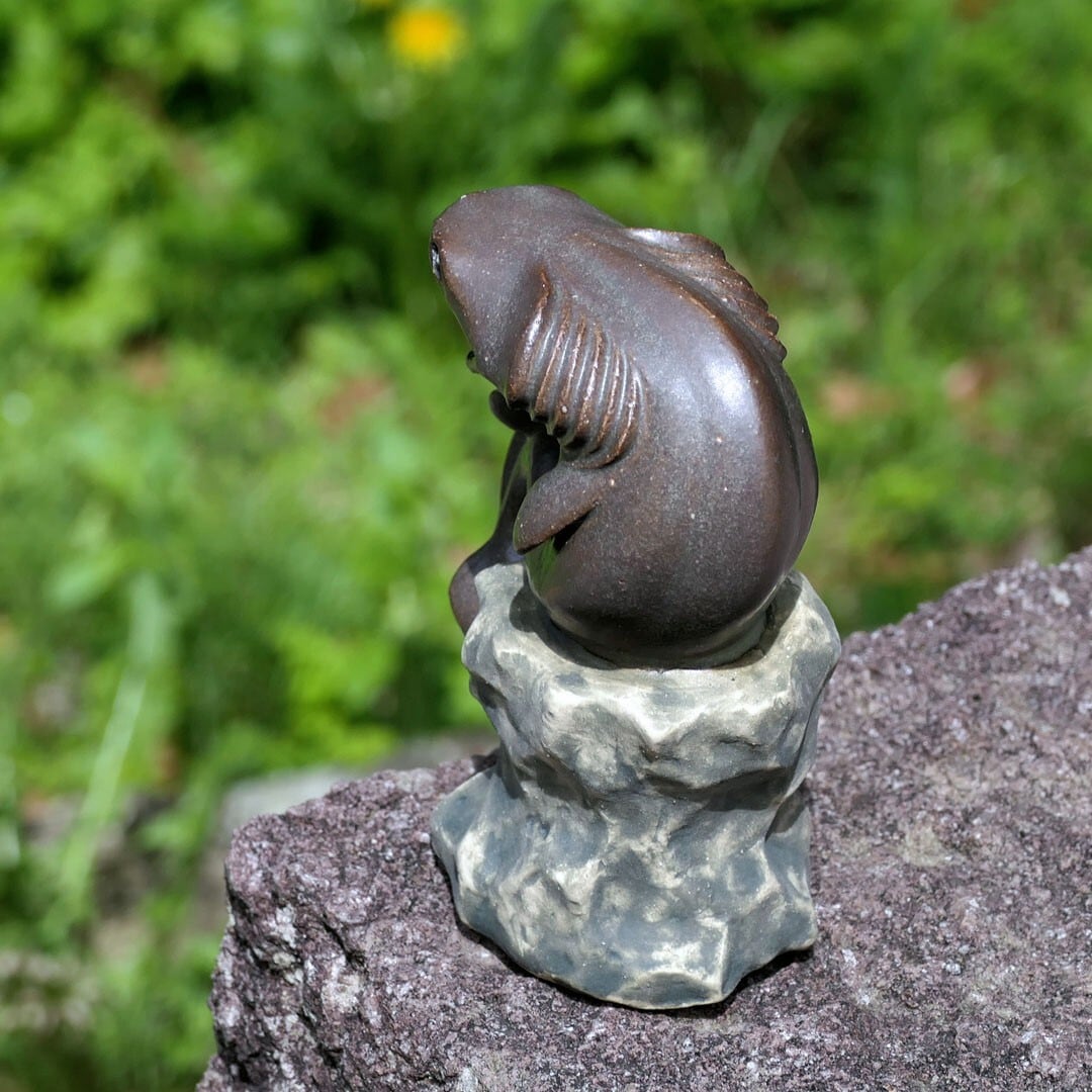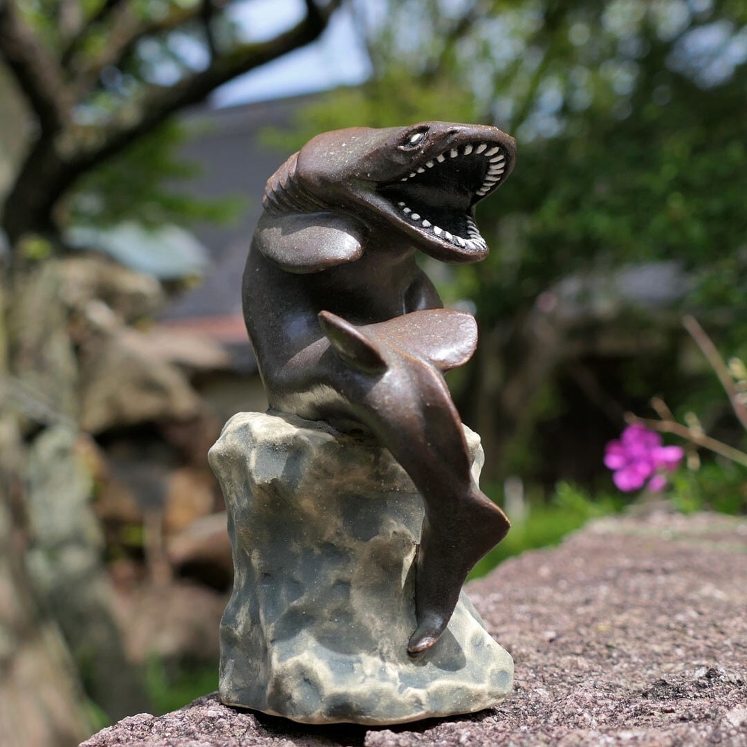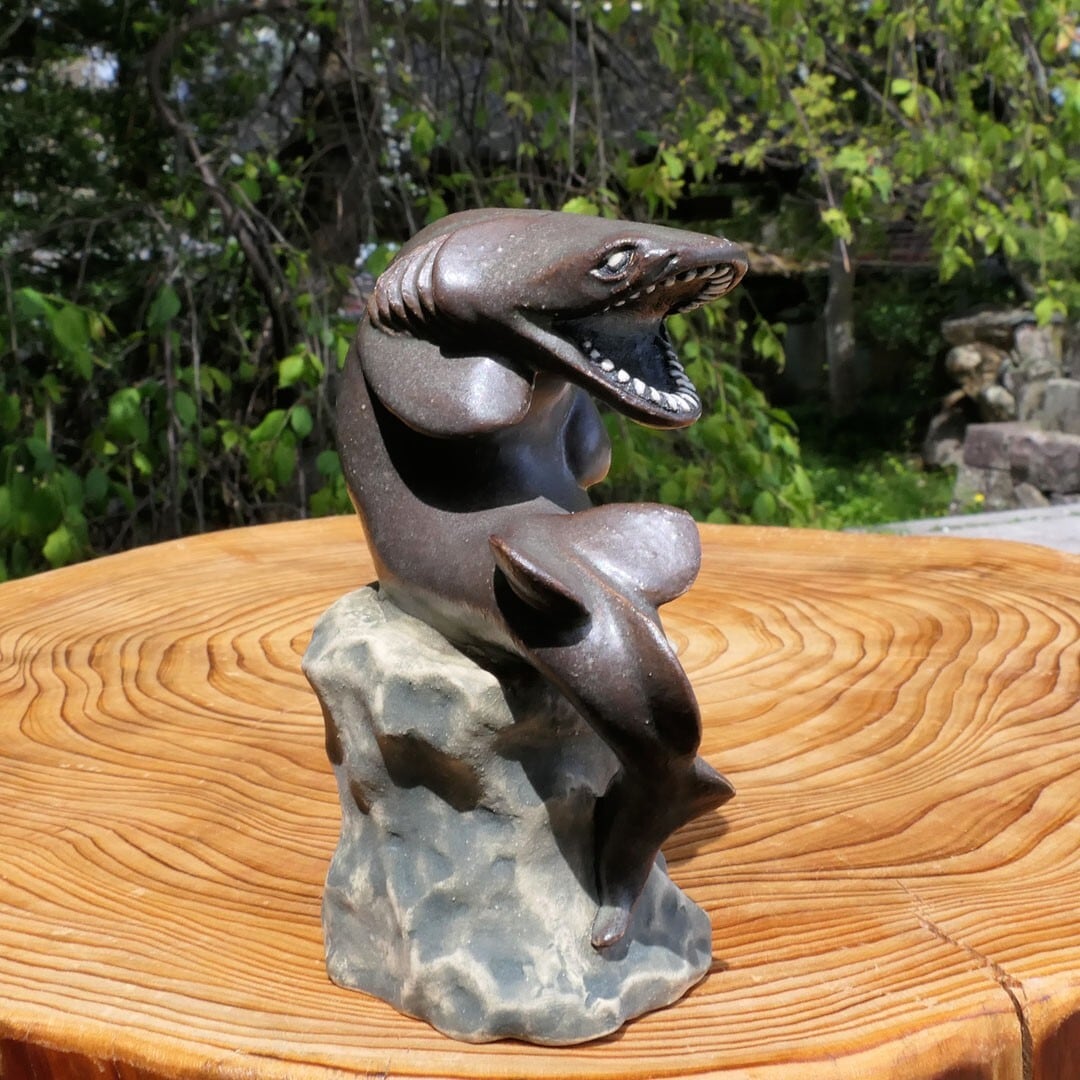考える人をラブカにアレンジした、陶製の彫刻です。